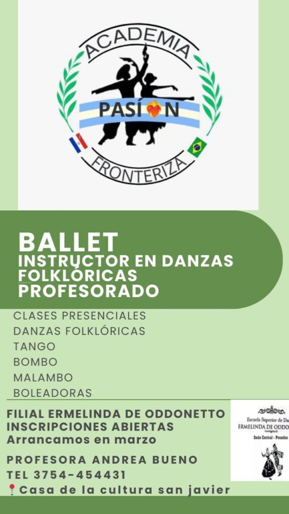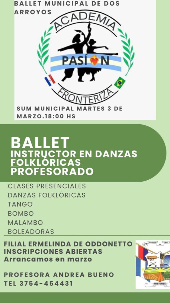 Por su parte, la Academia Pasión Fronteriza, Ballet Municipal de Dos Arroyos, anunció la apertura de inscripciones para el Profesorado e Instructorado en Danzas Folklóricas, una propuesta de formación integral que incluye contenidos de danzas folklóricas, tango, bombo, malambo y boleadoras.